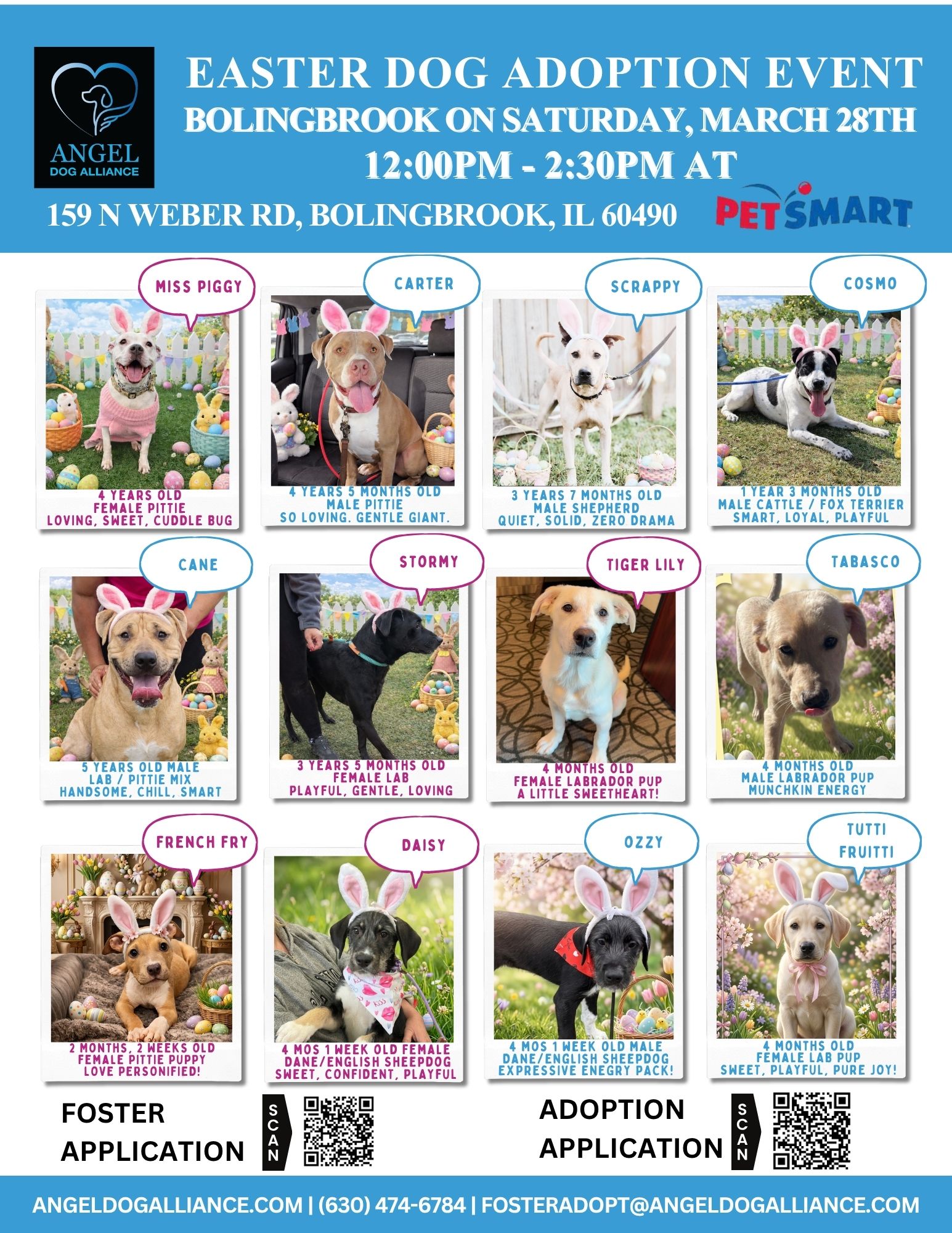 JOIN US at our dog adoption event on Saturday, March 28th, 2026 from 12:00 PM – 2:30 PM at the PetSmart 159 N Weber Rd Bolingbrook, IL 60490