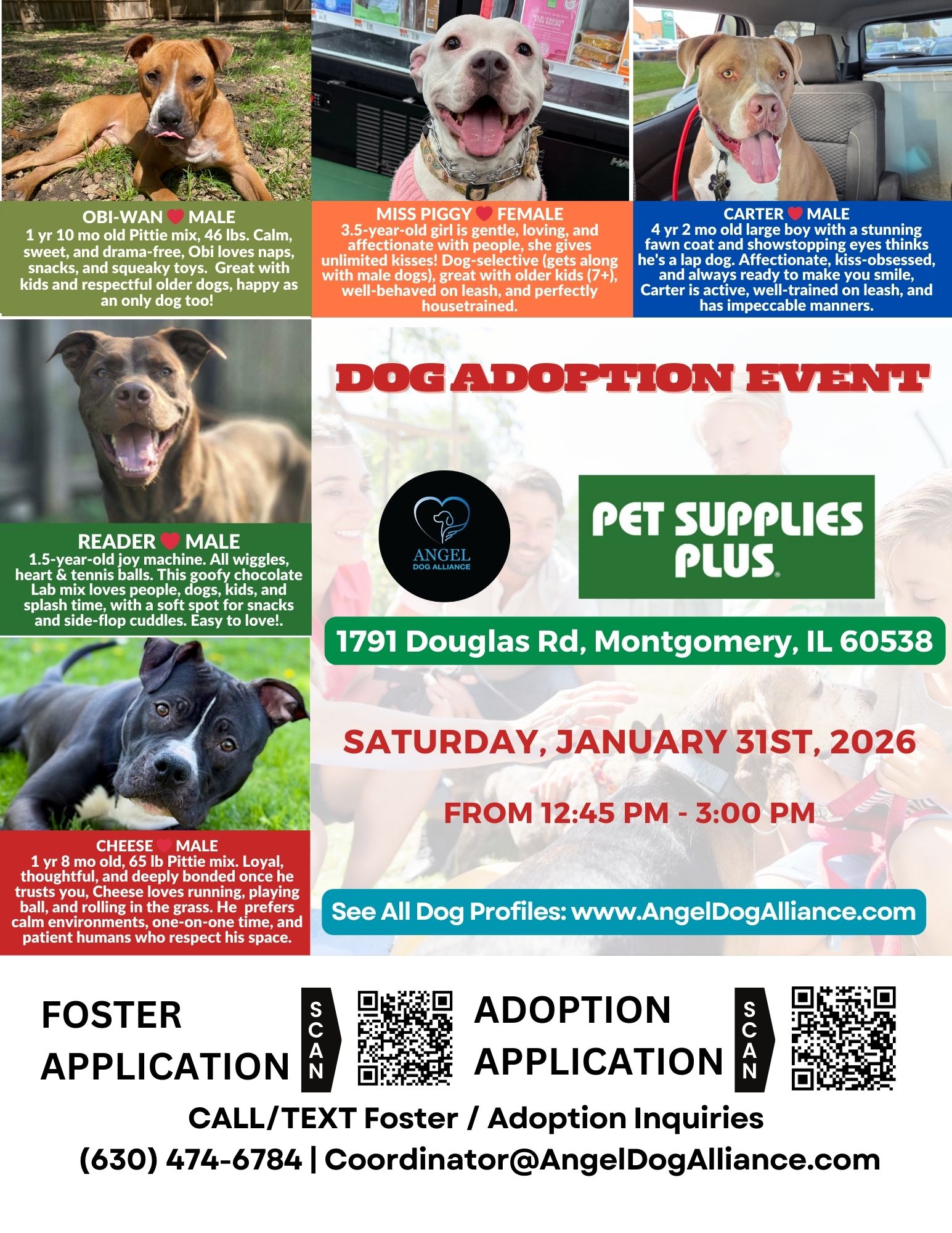 JOIN US at our dog adoption event on Saturday, January 31st, 2026 from 12:45 PM – 3:00 PM at the Pet Supplies Plus 1791 Douglas, Montgomery, IL 60538