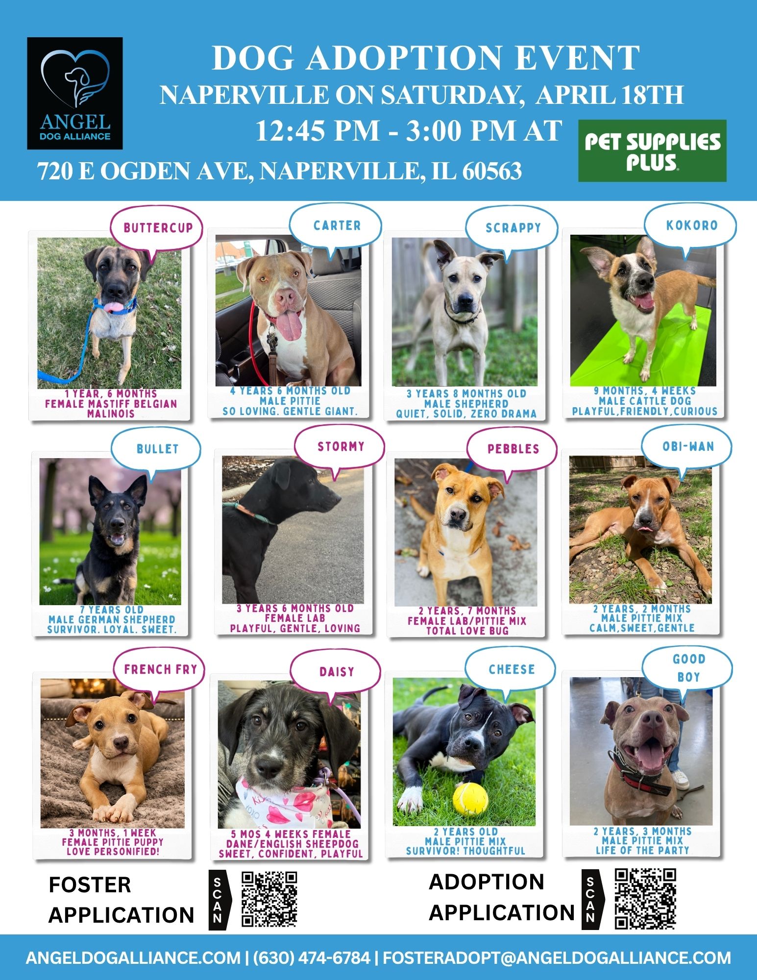 JOIN US at our dog adoption event on Saturday, April 18th, 2026 from 12:45 PM – 3:00 PM at the Pet Supplies Plus 720 E Ogden Ave, Naperville, IL 60563